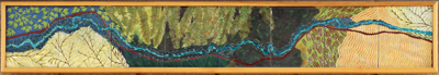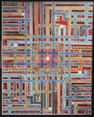 Islamic Circuitry is a layered, abstracted painting by artist Sidonie Caron. This painting is a departure from her earlier paintings based on patterns of Islamic carpets. She notes, “I saw a relationship between the geometric interlacing Islamic patterns and the patterns of the electronic circuitry seen on highly magnified views of computer chips…thus a whole new ‘computer series’ of paintings was born.” Caron has long been fascinated by Islamic carpets and their infinite variety in design.