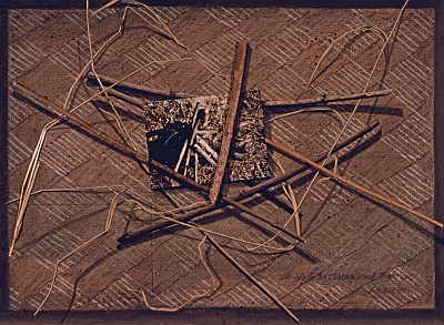 Further Migrations is a painting by artist Rob Gischer. It is part of a body of work that play with the energetic interaction of photo-realistic images and abstract backgrounds. This piece features scattered twigs layered over a patterned background. He notes, "The simple beauty of a single leaf or twig found near my studio is painted next to a careful reproduction of a photo of man's chaotic abstraction of his environment."