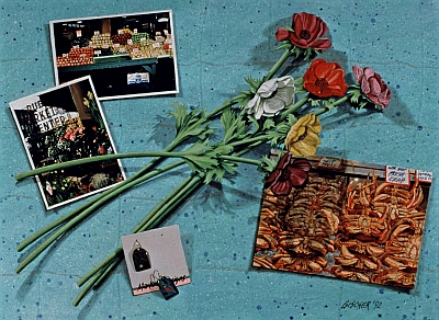 Artist Rob Gischer finds beauty in both chaos and order. Pike Street Market playfully layers realistic images against an abstract background to create a dynamic tension between opposites. He also notes that: "I am seeking universal qualities in my work, but a Pacific Northwest consciousness permeates and tempers the end product."