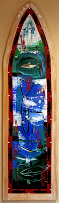 Watershed is part of artist Joanne Hammer's series of seven paintings shaped as shields and composed to conceptually explore environmental issues. The title of this piece refers to the area of land where waterways converge and divide, as well as signifying a crucial moment or event in time. Commenting on humanity's impact on the environment, this piece expresses concern about over-development while also symbolizing strength and protection.