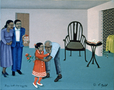 Artist Christian Michel created the painting 'Happy Birth Day Grand Pa" to encourage children and adults to visit their parents more. He based the scene on a real birthday visit, when a lonely seventy-four year old man's daughter, son-in-law, and granddaughter surprised him. Michel notes, "After a deep breath, grand-pa cried and said 'I feel strong enough to live seventy-four more years.'"