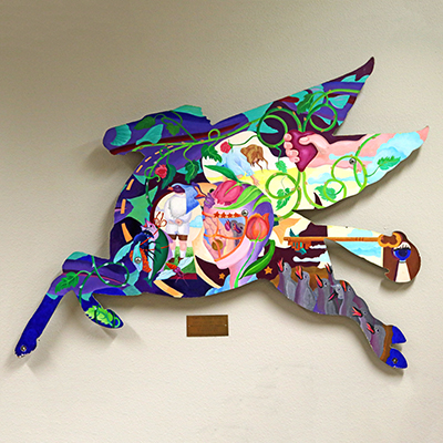 Filled with dream-like imagery, color, and symbols, artist Cheryll Leo-Gwin created Comes the Pale Horse as part of a series of four winged-horse-shaped steel sculptures that celebrate the imagination. Leo-Gwin notes that her choice of imagery was derived through "stream of consciousness" and contains both beautiful and challenging images. The steel shape of the winged horse was a castoff that Leo-Gwin found outside of a porcelain enamel plant. It was previously used to make old gas station sign reproductions.