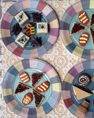 Hors D'Oeuvres Quilt is a whimsical and colorful assemblage by artist Robert Purser that features sewn paper plates and constructed "Hors D'Oeuvres" made from objects found around the artist's studio. He notes that the idea for this piece was inspired by his "childhood experience, spending summers on a farm in Louisiana. I used to watch my great-grandmother and grandmother make quilts from patterned flower sacks."