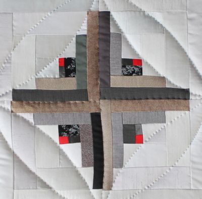 Artist Suzi Hokonson hand-quilted Points Aligned using a traditional quilting method and design called "Off-Centered Log Cabin." The small red squares in the quilt traditionally symbolize the chimney of a fireplace. She notes, "The lighter grays are symbolic of the happy occurrences in life while the darker grays remind us of the sad, burdensome times. Together, with the touch of red surrounding the piece, life is beautiful."