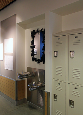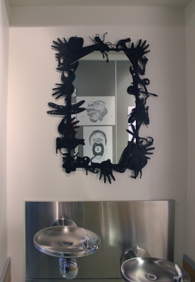 Artist Reis Niemi created Bugs & Tools Mirror by first drawing all of the individual images. He used images of bugs and tools from magazines and books. He then traced all of his images to scale on a big piece of paper. This paper became the pattern for a Plasma Cutting Torch, which he used to cut the image from steel. He notes, "I am attracted to the traditional role of a craftsman in society, to make sturdy attractive pieces that will last. Of course, I also try to give them a personality, to make them unique and different. I like my work to be a little humorous, so that it can be approached and enjoyed."
