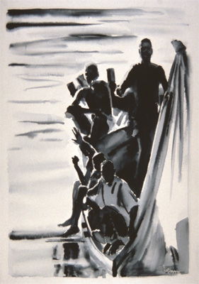 Artist Randy Hayes based his painting Adrift on a photograph he took in Mombasa, Kenya, in Africa. He felt that the image of men adrift in a harbor "symbolized something more universal." The composition references the painting "The Raft of the Medusa" by French romantic artist Théodore Géricault.