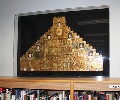 Itza is a sculpture by artist Barbara Barnes Allen. The title references an Indigenous Mayan culture located in the Yucatán region of Mexico. The tiered form of the sculpture suggests the step-pyramid castle at the center of Chichen Itza, a pre-Columbian city built by the Mayan people. The artist notes, “Many times in my travels I find small things to incorporate into my work such as coins, jewelry, trinkets, and collage materials. The extensive use of various paints and metallic leaf serve to enhance the architectural departure point from which symbolic and mystical themes emanate. The final product is hopefully a stimulating fusion of imagery and personal experience ingrained in each mythological temple.”