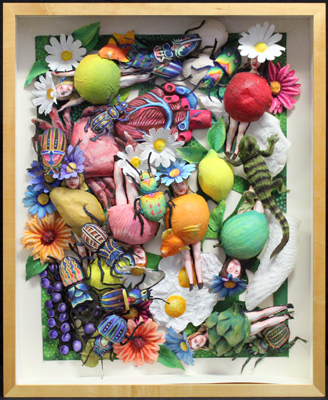 Cure for Optimism is a brightly colored and whimsical paper sculpture created by artist Phil Brazeau. To make the images, he molded wet rice paper around dolls, fruit, and toys. Once dry, the paper held the shape of each object, painted and arranged in what he calls a “tossed salad fashion.” He notes, “The end result for me is one of contrast between the Pollyanna like doll figures and the hoard of bugs running over them. It seems reminiscent of a pile of toys left on the floor or perhaps discarded thoughts or dreams being reclaimed by nature as in a compost heap.”
