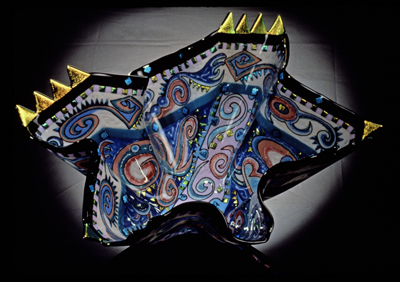 Artist Richard La Londe created this glass hankerchief bowl using a glass fusing technique. He layered a design of crushed glass onto each side of a sheet of clear glass. He then fired each side in a kiln, before forming it using a mold. It is part of his "Bol'ero" series of vibrantly colored and intricately patterned vessels. The artist's travels to Greece, Turkey, Mexico, and Guatemala inspired his designs.