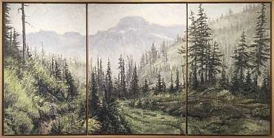 Alders at the Lakes is a watercolor painting by artist Linda Okazaki, and is inspired by the scenery she encountered hiking through the woods along the Elwha River in the Olympic mountains. Describing her process of composing this piece, the artist notes: "It is a subtle effect from one's memory where impressions of light, color, atmosphere and mood mix together and an idea is resolved into a painting."