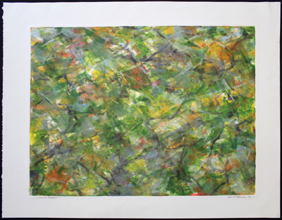 Forest Pattern is an expressive monotype print by artist Robert Graves. The abstract imagery uses layers of color to reference natural elements. Of his compositions, Graves notes, "My object is not to copy nature, but relate on the canvas certain entities of personal expression. This may be somewhat like stopping the natural process of growth and decay for an instant and exposing a condition that is worthy of meaning as an art form…" Monotypes are unique prints created by painting directly onto the printing plate.