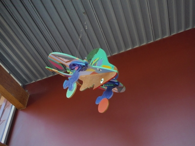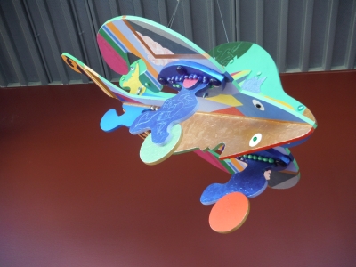 Frog Plane is a vibrantly colorful, whimsical three-dimensional construction by artist Mauricio Robalino. The artist describes his creative process as "a spontaneous channeling of creative visual energy emerging from a very deep, timeless, and intuitive part of myself."