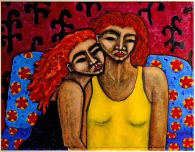 Composed of bold, expressive colors and emotive forms, The Sisters II by Harlow Morgan shows two embracing female figures. Morgan's main interest in her art is people and their relationships.