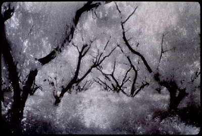 Peach Orchard, 1992 is an infrared image taken by photographer Ken Smith near Omak, Northwestern Washington. Infrared photography captures the glow of radiant energy not visible by the human eye. Smith notes that infrared film has a "unique quality that can be used artistically to express the spirit in the subject matter...Indeed, the film sees in a way that we do not."