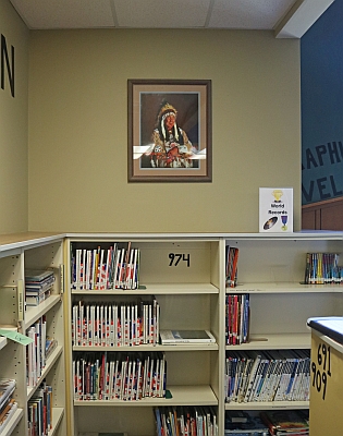 This photograph captures Chief and Elder William DePoe, of DePoe Bay, Oregon, wearing traditional ceremonial clothing. Marra notes, "He was born in 1912 in Upper Fann, Oregon (now called Logsden) to a Cheyenne mother and Siletz father. The Oregon town of DePoe Bay was named after his grandfather, Chief Charlie DePoe. He was raised by a family of leaders and educators as he accompanied his parents to varions reservations and Indian cultures. Returning home from the Navy as a World War II decorated survivor whose ship was sunk at Okinawa, he looked back to his Indian roots and realized how rapidly the cultures were being lost; and how little understanding there was of his people. He was moved to combine his love of music with his culture to compose original Indian compositions and to tell legends to be passed on. Chief wears traditional Plains Indian clothing, and Eagle feather headdress which represents his many years of service and accomplishments. The arrows on his face were marks given to him as a child by the medicine man indicating protection. He carries dancing sticks with white feathers that the little children can touch. He presents school programs, Sun dances, Rain dances; he dances at powwows, The Rose Festival, and performs with his wife, Princess White Lily, at DePoe Bay, Oregon."