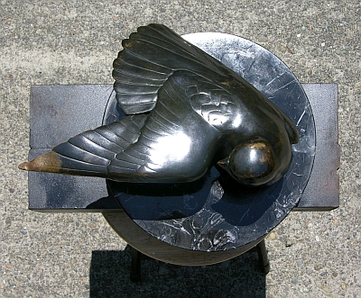 Stretching Kestrel is part of artist Tony Angell's body of bronze sculptures celebrating birds. He notes that this piece "is a study of one of the many graceful moments that these elegantly designed birds share with the patient observer. As a ballet dancer might stretch her leg with grace, so does the kestrel stretch the wing."