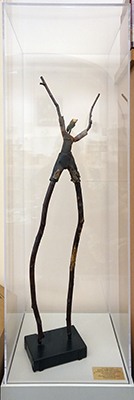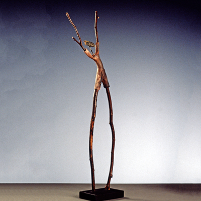 Tree Spirit #17 is part of artist Kathy Hubbard's series of sculptural figures. She first constructs hollow forms from clay, fired in a kiln. The arms, legs and head are tree branches she sourced on her property which she carves to fit the clay sculpture. She then wraps tree bark around the joints, and paints the figure. She notes, "My sculpture is figurative with plant, animal, and human attributes. It is meant to have 'feminine' strength, not necessarily be 'female.' It is a thickly textured dancer, sensual and primal, connected to nature because of the material used."