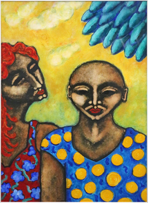Artist Harlow Morgan created Rosa & Tita by first printing a monotype background, on which she layered colorful acrylic paint and pastels. Her work focuses on an exploration of our relationships with one another. She notes, "As I work, I often experience personalities and stories taking form. It's as if there is a dialogue, a history, unfolding before me as I paint".