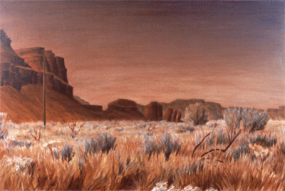 Coulee, West View is part of a body of landscape paintings by artist Anne Fiske that express the feeling of being in nature. This painting captures the play of sunlight on the cliffs at Sun Lakes State Park, near Coulee City, Central Washington. She notes, “I seek big open space sites in the landscape that conform to compositions I want. Once I have found a site, I sketch from life as I want the painting to be about a true and memorable experience.”