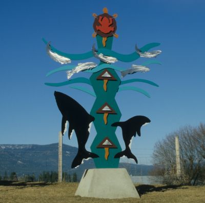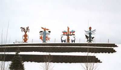 All Our Relations is a sculptural installation by artist David Govedare. The four symbolic figures – of humans, and animals of the sky, land, and water – are built of colorful steel.