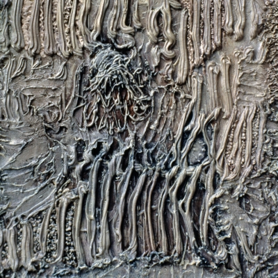 Artist Linda Kraus-Perez created the painting Ice by layering painted surfaces with textured caulk and encaustic wax. She notes that this technique requires experimentation, and being open to accidents and risk. The linear patterns and structure of this piece reference European medieval manuscripts (approximately 450-1450), Islamic architecture, and calligraphy. She describes the surface as "embellished with fragile and detailed marks reminiscent of the ancient marks of language."