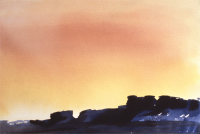 Dry Falls is part of a body of landscape paintings by artist Anne Fiske that express the feeling of being in nature. This watercolor highlights the rich interplay of light, color and shadow over Easter Washington canyons at sunset. She notes, “I set out to seek big open space sites in the landscape that conformed to compositions I wanted. I sketch from life, as I want the painting to be about a true and memorable experience.”