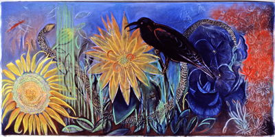 Summer Garden is a large and vibrantly colored pastel drawing by artist Nancy Halbrooks. Inspired by her experiences gardening, she created this artwork in the summer of 1995. She notes, “My own garden is a rich tapestry of birds, insects, flowers and plants and often overgrown, overrun with weeds and rarely tidy. I like traditional and common flowers such as dahlias, daisies and sunflowers, loud and brassy flowers typical of the summer and easy to grow. The crow is a favorite figure of mine, a character that inhabits our area with its wise and comic antics and fills it with sound. I honor the insect by including a bug or two, also part of the rich life of the garden…The garden became a metaphor for the creative process for me, the garden of one’s self and mind, rich with possibilities and potential.”
