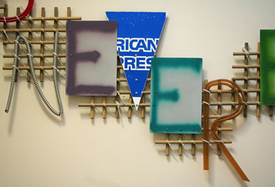 Politically Correct Graffiti/Learning Never Ends is one of two mixed-media wall sculptures by artist Katherine Holzknecht comprised of text and found objects. As a reinterpretation of graffiti, the artist seeks to "give the audience a positive message in a challenging medium." It is installed next to another piece titled 'Words of Wisdom'.