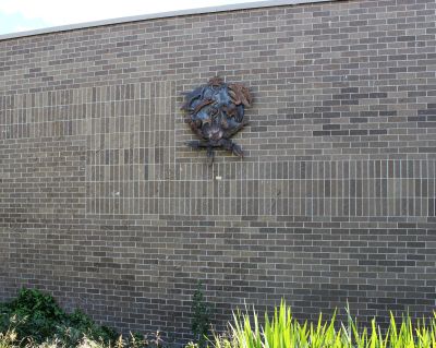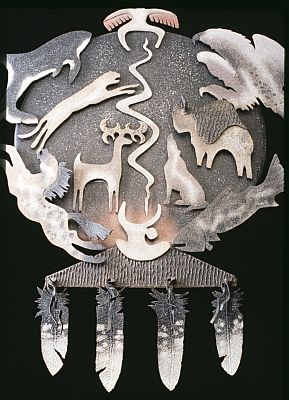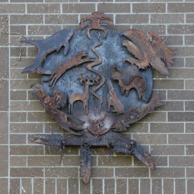 Circle of Friends Series #3 is part of Northwest artist David Govedare's series of symbolic shields. These metal sculptures use landscape imagery and animal figures to create visual narratives. He notes, "The shields with animal imagery are all creatures with close ties to my own life. I only depict those creatures that I have shared contact with...the development of my art comes from man's ancient urge to document inspiration."