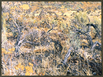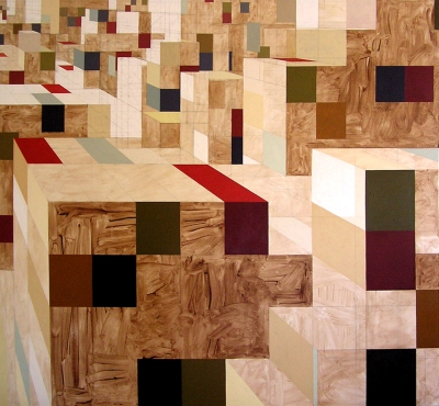 Artist Jack Chevalier composed Untitled using both abstract and representational imagery to comment on the formation of our cultural symbols. He notes, "At some point, probably in very distant history, the geometry, symetry and logical structures in nature (night/day cycles, arc of the sun, horizon line over water, triangular light rays through the clouds, facets of a crystal, etc.) found themselves reflected onto the decorative motifs of a pot, a mask or a dwelling, from there to the rudiments of written language, to the iconography of a culture, to the formulation of history. I would like to make this analogy in my artwork on a personal level."