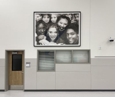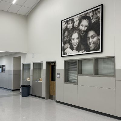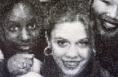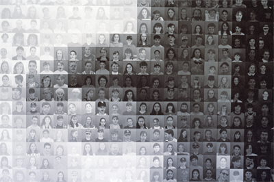 Komachin '96 is a photographic mural created by artist David Joyce for Komachin Middle School. The mural features over 15,000 postage stamp-sized portraits of Komachin students, arranged as pixels to form a larger portrait image. To create the mural, he spent four days photographing 600 students and teachers against different backgrounds. He created a booth with a hand-held shutter, allowing students to create and control their own self-portraits. He then used digital software to sort the individual portraits into different values of white, gray and black. Using Adobe Photoshop, he replaced each pixel in the larger image with a small portrait of corresponding value. The viewer's experience of this piece changes as you approach the piece. At first, it appears as a straightforward photographic mural. Stepping closer, the image changes dramatically as you become aware of all the portraits that make up the whole.