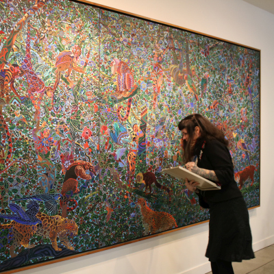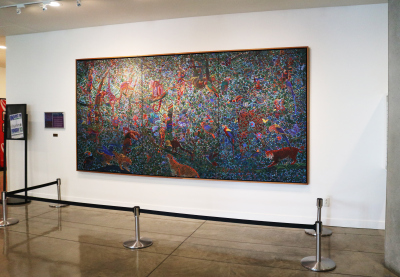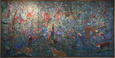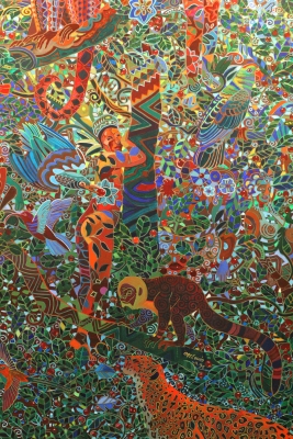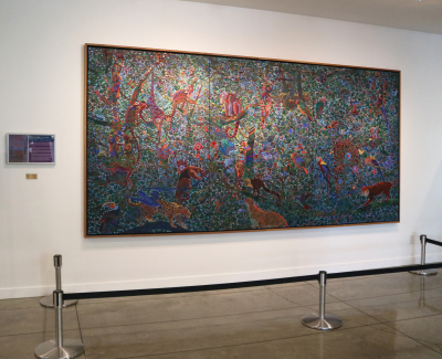 Jungla Encantada is part of artist Alfredo Arreguín's body of colorful and intricately patterned paintings. Of this piece, Arreguín notes "I have re-created the rich colors, teaming, and overwhelming presence of the tropical environment. Dense patterns reveal and conceal plant, animal, and human forms." When you look closely, the artwork's surface is also covered in detailed patterns.