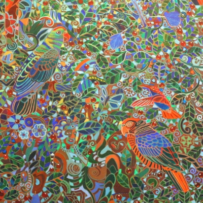 Seattle-based artist Alfredo Arreguín (1935-2023) created lush, elaborate, colorful paintings that feature plants and animals. They are often covered with extremely detailed layers of patterns that can be seen best up close – Arreguín described these layers as “lace-like screens.” He noted, "The magic of the jungle has had a strong influence on my work."Arreguín was born in Morelia, Michoacán state, Mexico. He emigrated to the United States at age twenty-two to attend the University of Washington (1967 Bachelor of Arts and 1969 Master of Fine Arts degrees) and developed as an artist in Seattle, where he has lived since 1956. He was drafted into the U.S. Army and spent thirteen months in Korea. During that time, he visited Japan twice for one week of R/R (Rest and Recuperation). He notes that his time in Korea and Japan "opened my eyes to the visual richness of their culture; some elements of their art and designs would influence my work many years later." He has been honored with many awards and honors over five decades, including from the University of Washington, a Washington State Governor's Arts and Heritage Award in 1986, and several from Mexico, including the Ohtli Award, the highest recognition given by the Mexican government for contributions to the Mexican community abroad. His art is in collections and museums around the world, including the National Portrait Gallery and the American Art Museum (both in Washington D.C.), Seattle Art Museum, Tacoma Art Museum, and in Mexico and Spain. In 2018, the Bainbridge Island Museum of Art hosted a retrospective exhibition of his art, “Alfredo Arreguín: Life Patterns”.