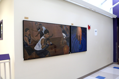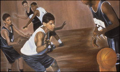 ‘Experience the World Through Your Senses’ is a series of 18 hand-painted photographs by artist Connie Ritchie. The series celebrates how our five senses (sight, smell, sound, taste, and touch) unify us all and connect our experiences to our memories, imagination, sense of place, and community. ‘Basketball’ depicts a "no touch" sport. It captures the intense interaction, movement, and concentration involved in the sport, as well as the essential element of passing (and touching) the basketball. It is installed next to 'Water' as two visual representations of touch.