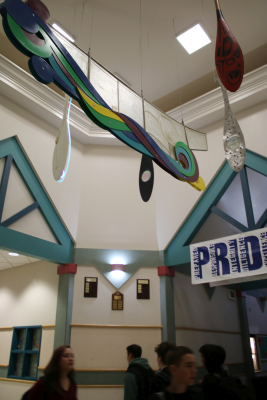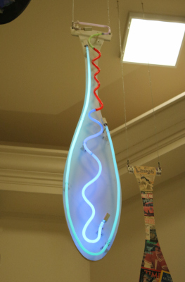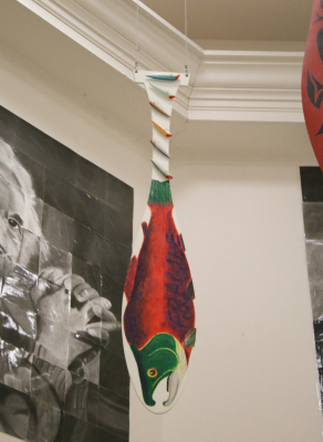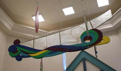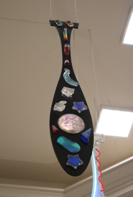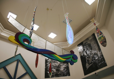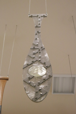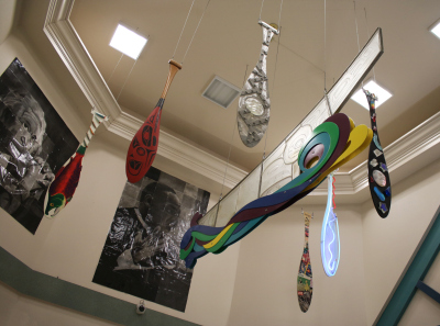 Time Traveler is a suspended sculpture by late Native American artist and master carver Marvin Oliver (Quinault and Isleta). He created the artwork using traditional Northwest Coast designs and motifs. The piece is comprised of a central glass canoe and six vertical paddles created from aluminum, wood, glass, and neon. Each paddle has its own symbolic meaning, and together they represent ideas about life, time, tradition, and the universe. Oliver's hope is that the artwork will inspire students to pursue and reflect on their own ambitions.