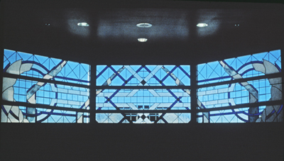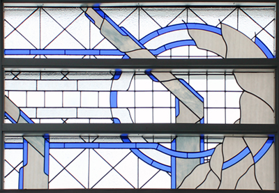 Solar Mitosis is part of a series of three window installations created by artist Jack Archibald. The abstract compositions feature a combination of geometric and organic forms. Each artwork highlights dynamic changes in color and light. Archibald notes, "just as light metamorphoses through the day, the windows too have a kinetic energy"