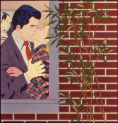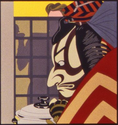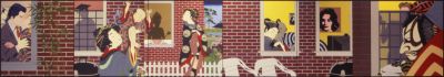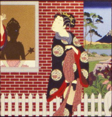 Roger Shimomura created the six-paneled, 36 foot long painting An American Neighborhood for Southridge High School in Kennewick, Southeastern Washington. Shimomura describes the artwork as a powerful investigation into how stereotypes, conformity, and customs impact "our country's advancement towards a more diverse and equitable, multicultural society." He continues, "It is my hope that this mural suggests a visual forum upon which this topic might be continually discussed and debated." In the painting, he has combined modern American culture and traditional Japanese figures. It raises questions about prejudice, expectations, and bias. How do cultures blend with and borrow from each other? What is cultural exclusion? What is an American? What does it take to assimilate? In response to the artwork installation, the Tri-Cities Japanese-American Community compiled and donated new curriculum and reference materials. These were designed to assist students in understanding both the artwork and the Japanese-American experience in the U.S.