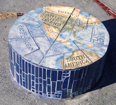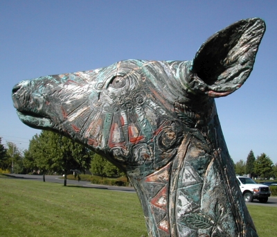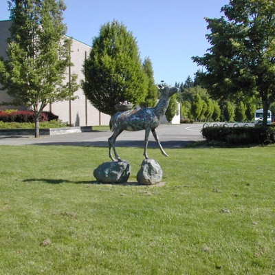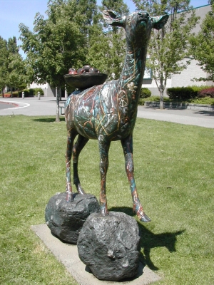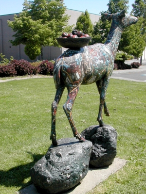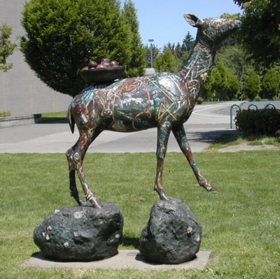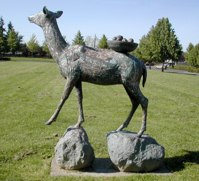 On the Way is a cast bronze sculpture by artist Brad Rude for Alki Middle School in Vancouver, Southwestern Washington. The artwork celebrates the cultures and natural history of the Pacific Northwest. Rude patterned the surface of the deer figure with landscapes and symbols of the area such as the Mount St. Helens eruption, an ox, wagon wheels, references to geology, and more. The sculpture also points to themes of transition and change. A basket of apples in a woven basket balances on the back of the deer, who is in mid-step as if walking into the future.