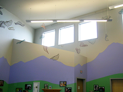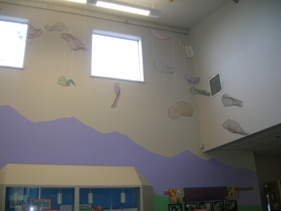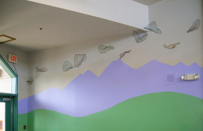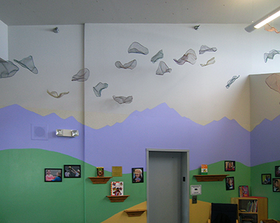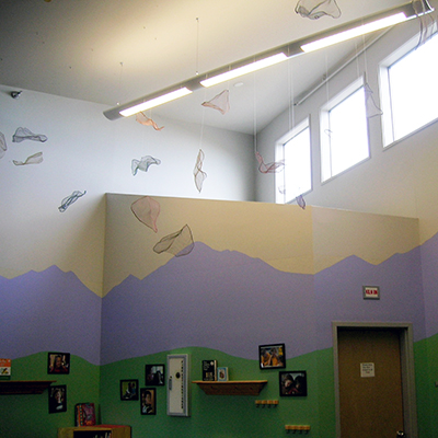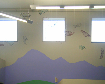 The Rainbow Dragon's Scales is a suspended sculpture created by artist Patricia Ravarra. Comprised of 54 different elements, she made each colorful abstract form by hand-weaving together aluminum wire. She then shaped each piece into concave, scale-like forms. She created the "Rainbow Dragon" idea as a metaphor for her artistic process, and she hopes it inspires students to create their own stories. She describes the "Rainbow Dragon" as a kind and shy dragon who brings good luck after it rains.