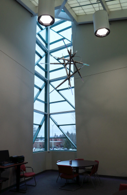 Voices of the Columbia is a sculpture created by Howard Meehan and Kathleen Meehan. It is a celebration of the Columbia River and the people it has supported over the course of Washington's history. The hanging sculpture references fishing nets, sailing rigging, river pilings, and sparkling ripples of water.
