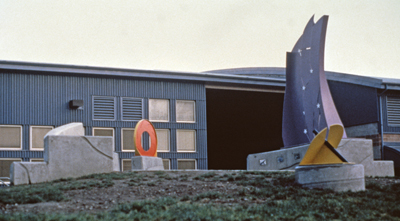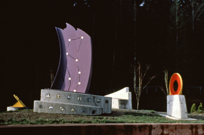 Stuart Nakamura's sculptural installation Galactic Garden features vibrant geometric forms. Colorful ceramic tiles also decorate the concrete foundations. It acts as a central gathering place for students at Skyview Elementary in Bothell, Western Washington.