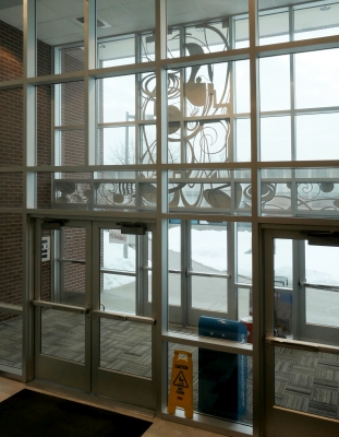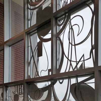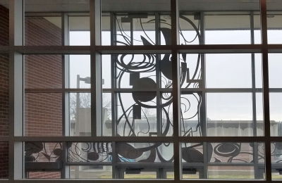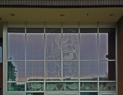 Dia - Acqua - Spirale is a large, aluminum installation by artist Virginia Paquette at Spokane Falls Community College, in Eastern Washington. It is comprised of fourteen panels inspired by the flow of water. Three Greek words make up the title. The words translate to "Across - Water - Spiral." The artist describes the composition as a "drawing in space." She continues that the design features "lines of force that circle around, spiral, and penetrate each other like waterfalls and vortices." The artwork was partly inspired by the nearby Spokane Falls.