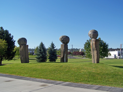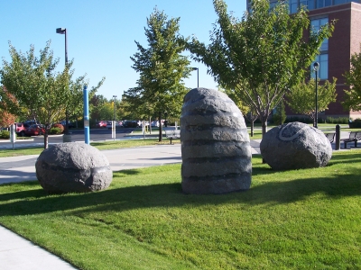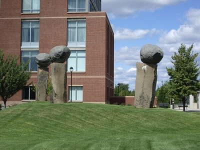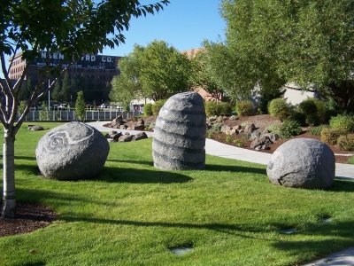 Cooperation is comprised of a series of seven carved and polished sculptures created by artist Michihiro Kosuge. They are installed at multiple locations near the Spokane River, on the Washington State University satellite campus. The stone sculptures resemble ancient monuments and act as a gathering place for students. They also investigate mass, balance, proportion, and texture.