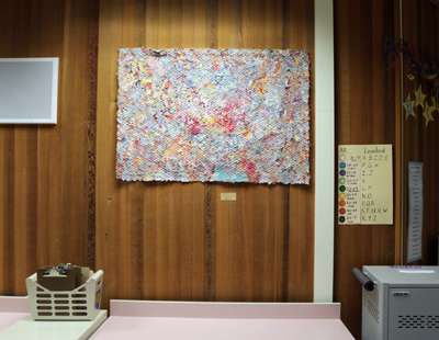 Remains To Be Seen #1 is an elaborate textile construction by artist Susan Brandeis. This piece was created by sewing together and assembling scraps of screen printed and textural fabrics the artist had cut away during the construction of other artworks. Combining motifs and themes from multiple pieces, Brandeis describes this piece as equivalent to "a free-form sketch--an abstract painting in thread and colored fabric instead of pen and paint, gestural rather than intellectual."