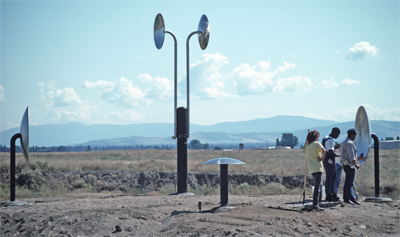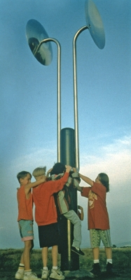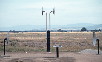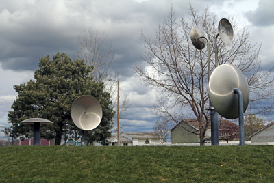 Big Eyes/Big Ears Science Playground is a large-scale installation by artist team Bill Buchen and Mary Buchen. It is located in a public park in the city of Airway Heights, in Eastern Washington. The sculpture invites you to interact with it and have sound-based and visual experiences. It consists of a periscope that overlooks the nearby park, two shallow curved dishes that reflect sound, and a metal drum, all located on a man-made hill. By playing with the sculpture’s parts, you will hear and see unexpected and distorted sounds and angles of the park.