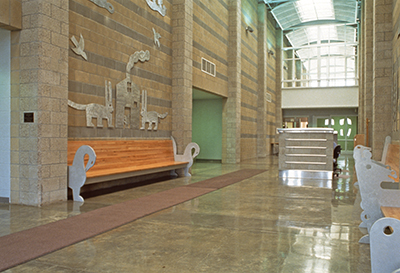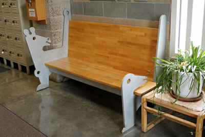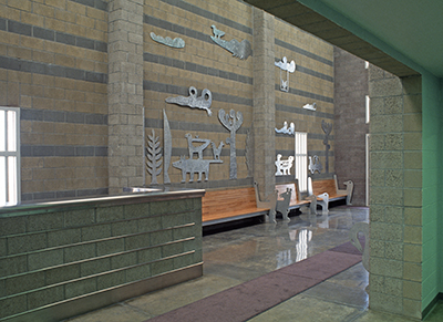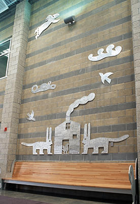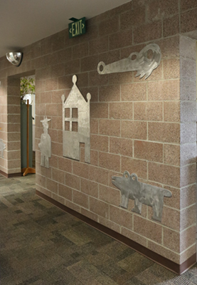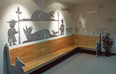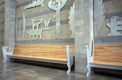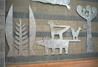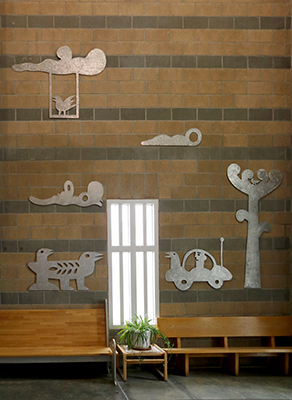 Artist Garth Edwards created these playful cutouts and benches for the visitor's area at Airway Heights Correctional Center. While visiting the facility during planning, Edwards noticed "a certain anxiety during the check-in process." His whimsical images of plants and animals create a welcoming environment for all visitors.