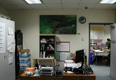 Fallen Tree Creek is a painting by artist Roger Jones. He notes that the composition encourages the viewer's eye to search the painting, "taking in the textural play of landscape elements as it flows along."