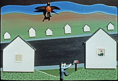 ‘The Letter’ is a charming wooden sculpture hand-carved and painted by artist Stan Peterson. It shows many aspects of the everyday. The composition features a mailman, a person reading by their window, and a robin that seems to almost fly out of the frame. The artist notes that together these ordinary images create “a feeling of waiting and expectation.”