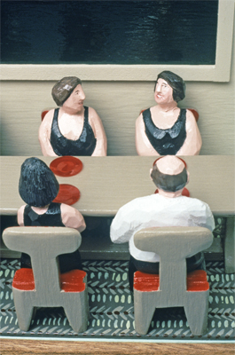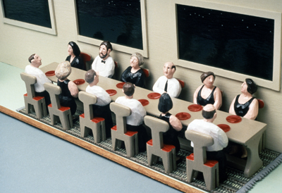 The Dinner Party is part of artist Stan Peterson's body of carved wooden sculptures based on his memories growing up outside of Portland, Oregon. He hand-whittled each element over the course of several months. Two events blended in Peterson's memory to inspire this piece. One was a dinner at an old hotel on the Oregon coast. The other was a black tie wedding reception. He notes, "Although the two events occurred within a few weeks of one another, the edges of the memories blurred into one Dinner Party. I set about to carve a piece which had coastal folks dressed up for a formal evening. The characters have set places at the table but they can get up and change chairs with any other guest. There is implied the possibility of talk, gossip, deals to be made, promises whispered."