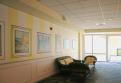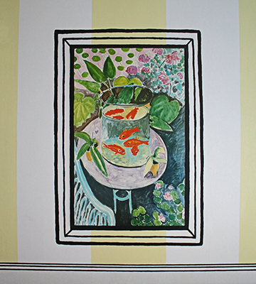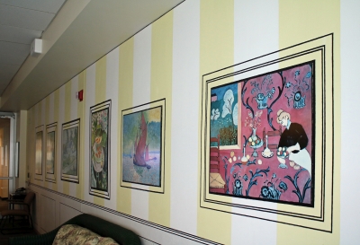 Salon is an interactive room installation by artist Justen Ladda. It is comprised of furniture and painted walls with reproductions of paintings by famous European artists such as Vincent Van Gogh, Henri Matisse, and Andrew Derain. Ladda wanted to create a kind of stage – a space that is relaxing and cheerful – for the Department of Labor employees who often do stressful work such as managing workers’ compensation claims. The imagery and objects remind us of summer, nice weather, and vacationing. The resulting artwork is a conceptual work of art, as well as a place for Labor and Industry staff and visitors to relax and reflect. This artwork is part of a series of site-specific installations by artist Justen Ladda for seven Department of Labor and Industries sites. The seven artworks are broadly inspired by labor and industry in Washington State.
